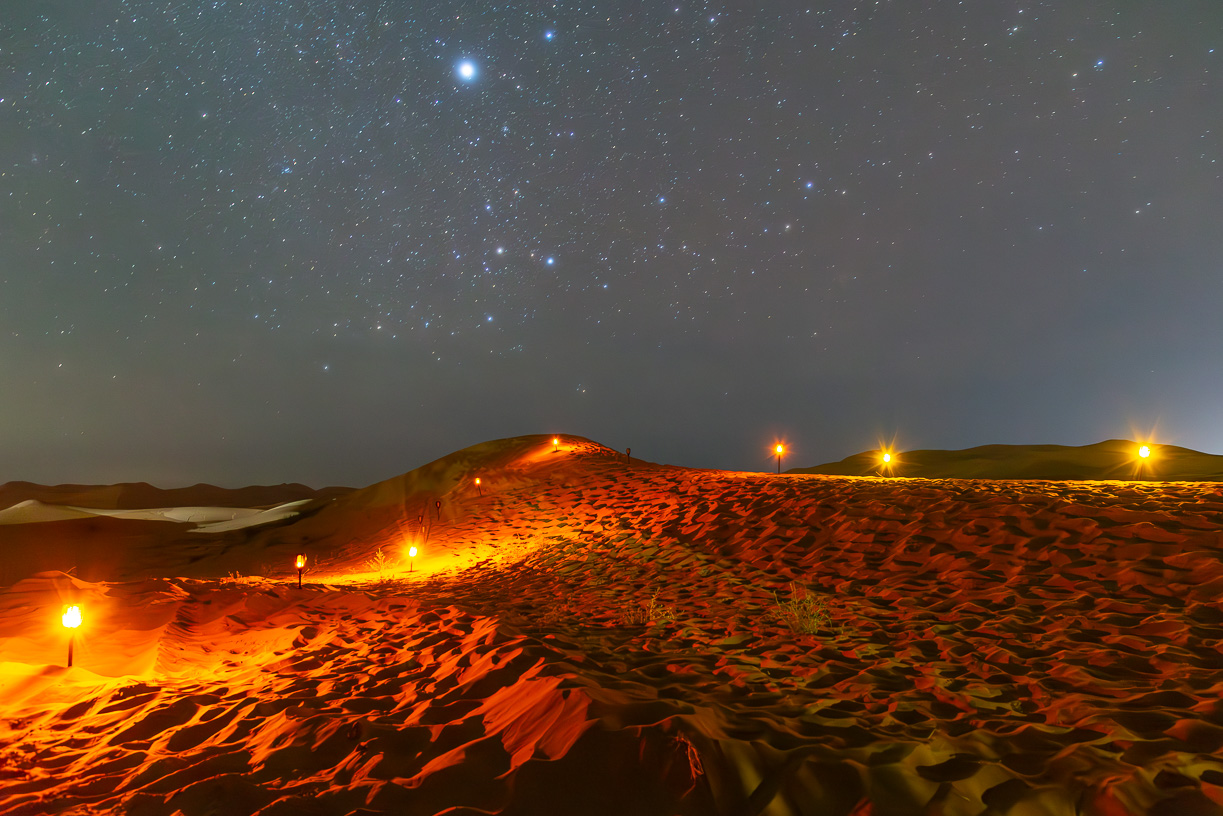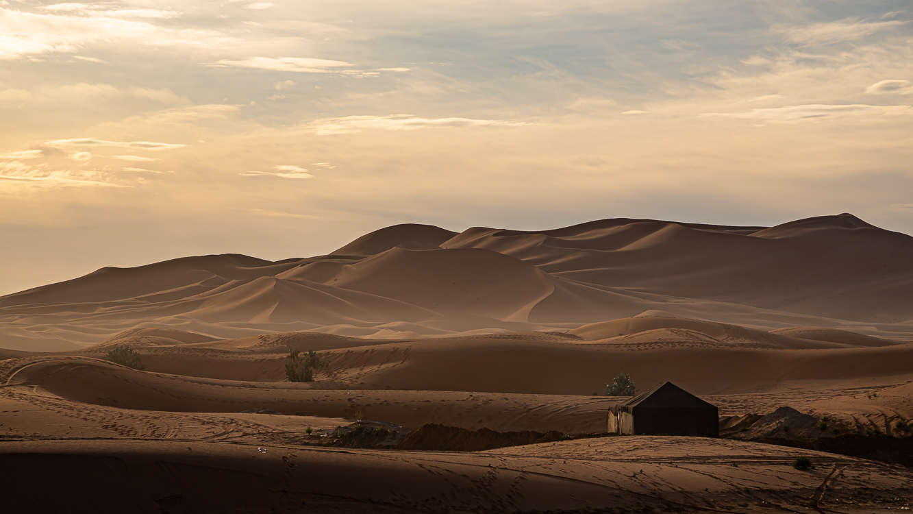 The caravan route finally reaches the heart of the desert, toward Merzouga and the golden dunes of Erg Chebbi. Here the landscape is stripped to its essence: sand, sky, and silence. Nights beneath the stars, in Berber tents with the distant sound of drums, evoke the ancient spirit of the caravans that once pressed on toward Timbuktu and the East.