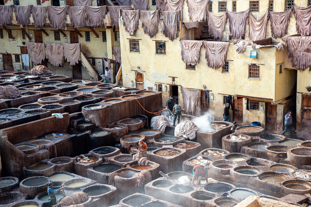 In the afternoon, find your way to the Chouara Tanneries. From the terraces above, you’ll witness one of the most iconic sights of Fez: vats of ochre, saffron, and indigo where leather is dyed by hand, a practice unchanged for a thousand years.